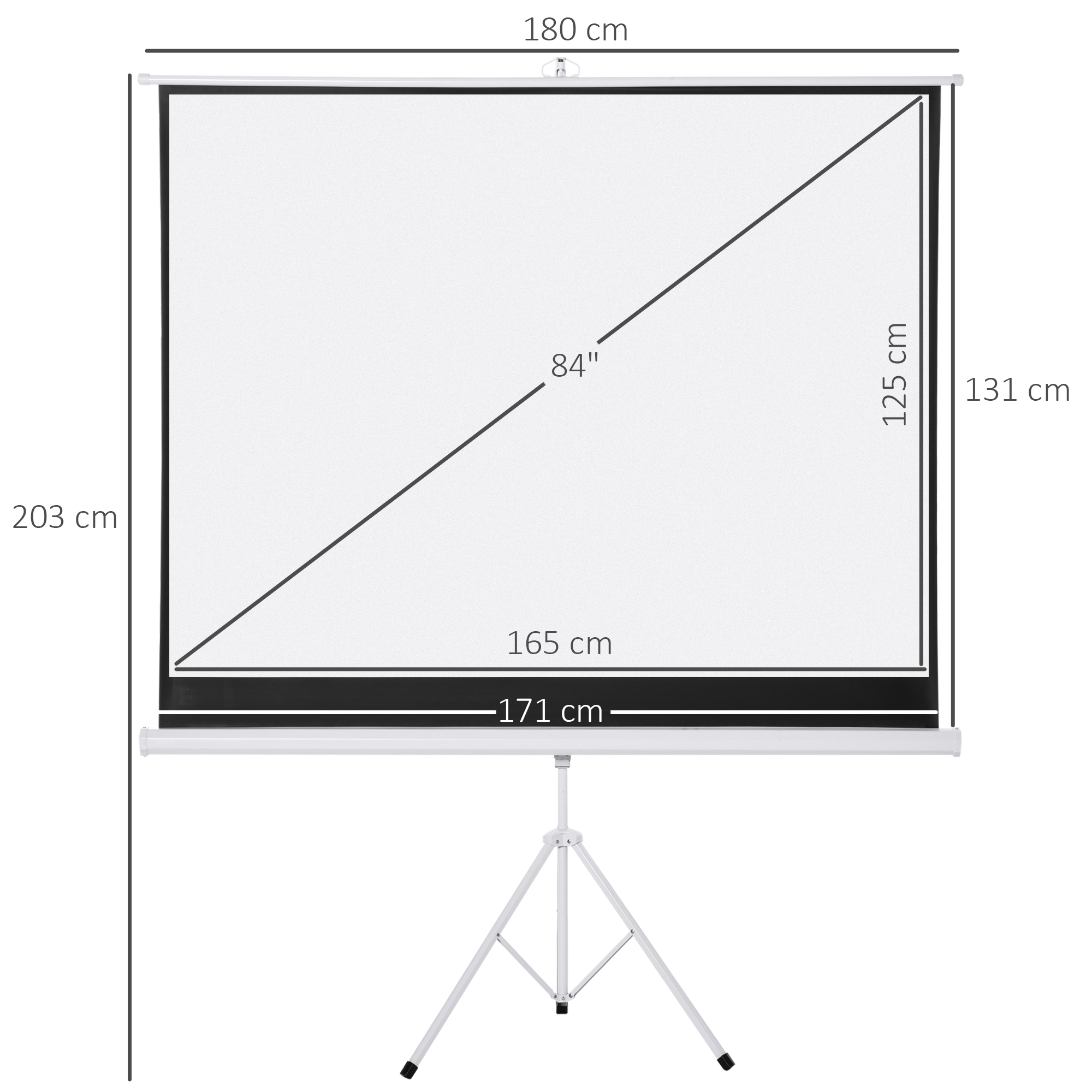 - Abmessungen der Beamer Leinwand: Gesamtabmessungen: 171L x 131B cm (84 Zoll), Länge des Metallgehäuses: 180 cm