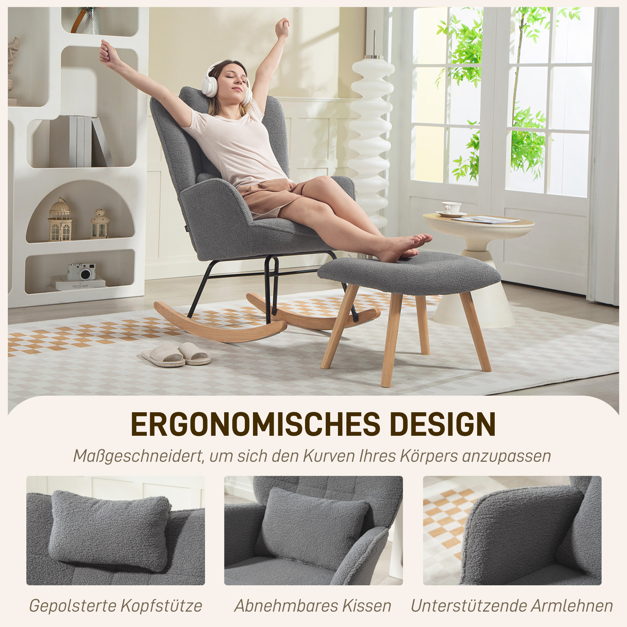 Produktinformationen "Schaukelstuhl mit Fußhocker, weicher Fleece-Bezug, Holzbeine, Kissen, hohe Rückenlehne, Schaukelsessel, Dunkelgrau"