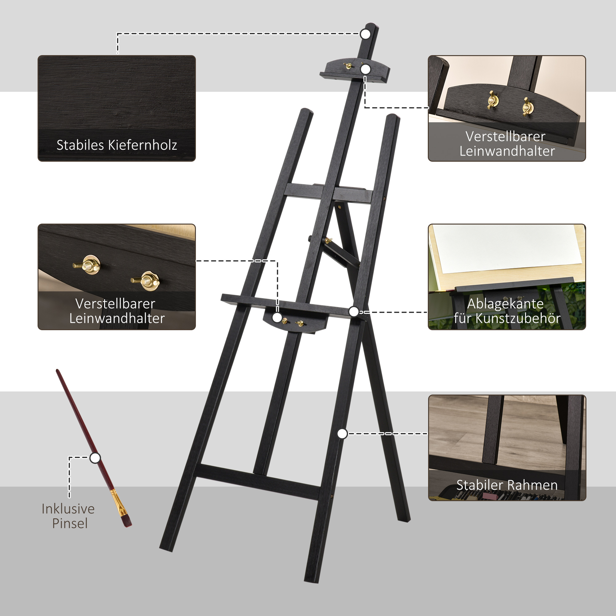 Lassen Sie Ihrer Kreativität freien Lauf und üben Sie sich in der Malerei, mit unserer eleganten Staffelei von HOMCOM, Diese Staffelei ist aus natürlichem Massivholz gefertigt und in elegantem Schwarz lackiert, hält sie Ihre Leinwände und Gemälde sicher während des Malens, Sie überzeugt durch vielfältige Einstellungsmöglichkeiten, So können Sie Leinwände verschiedener Größen einfach befestigen und komfortabel im Stehen oder Sitzen arbeiten,