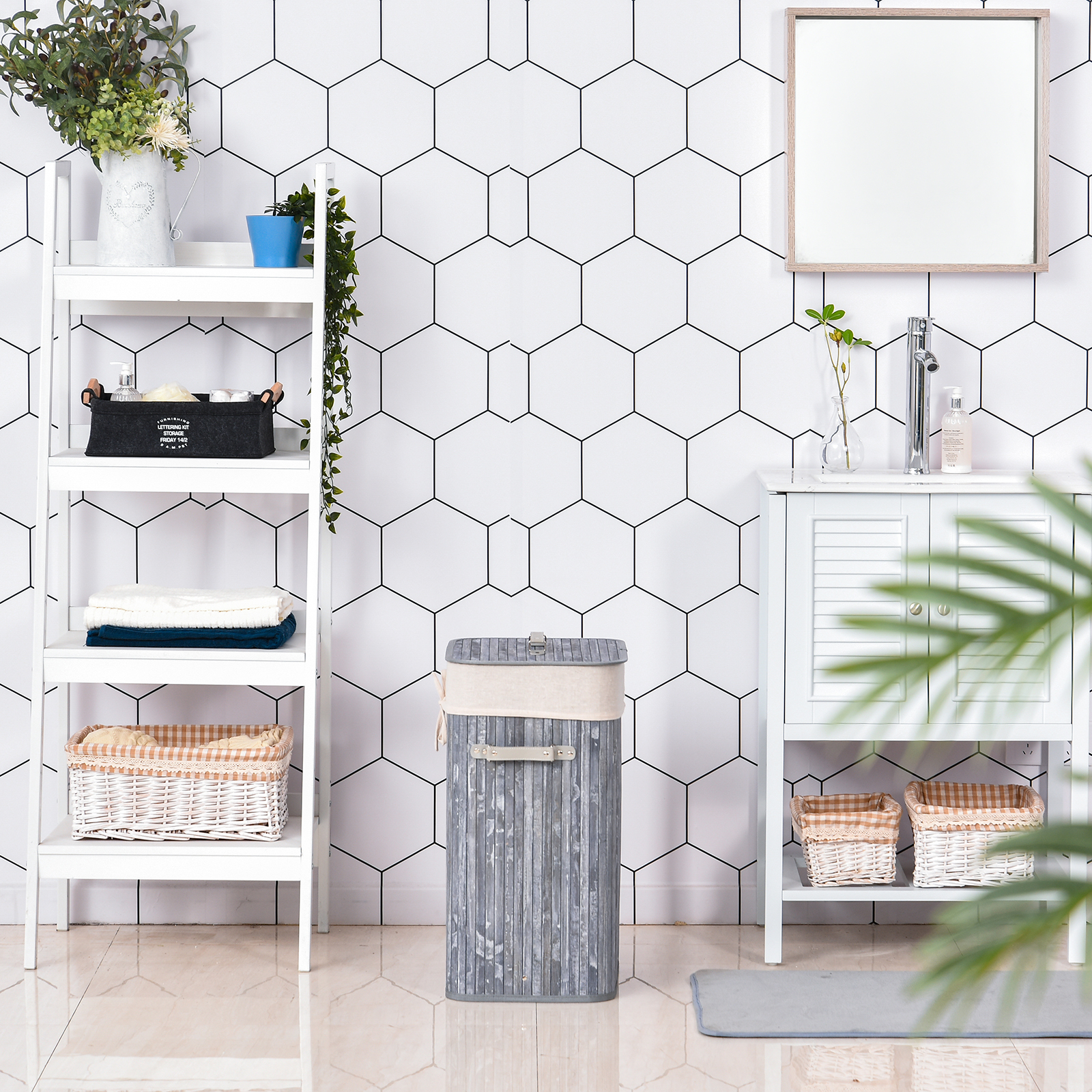 - - Material: Bambus, Wäschesack aus Segeltuch, Griffe aus PU