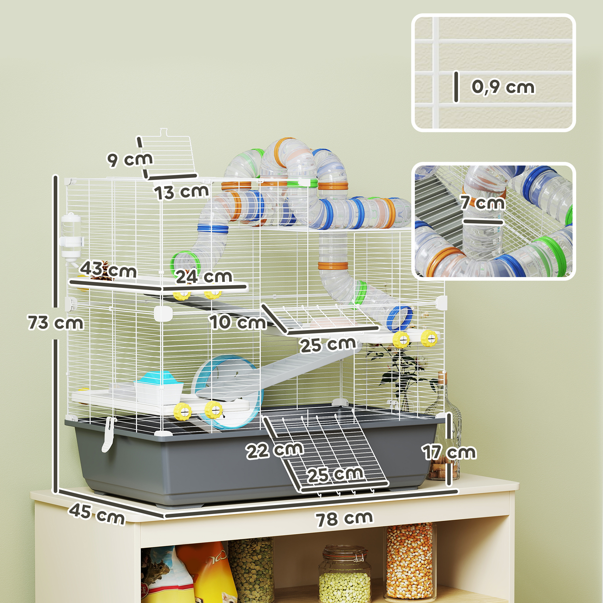 Entdecken Sie den PawHut Zwerghamsterkäfig! Der Kleintierkäfig bietet 4 Ebenen, ein buntes Röhrensystem zum Erkunden und reichlich Platz mit drei Stangen, Rampen und einer kuscheligen Hütte, Mit zwei Fronttüren und einer oberen Klappe leicht zugänglich, perfekter Hamster Käfig für kleine Nager, die die Abwechslung lieben,